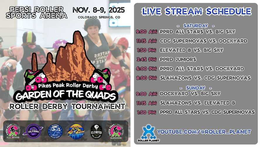 The Garden of the Quads Roller Derby Tournament rolls into the Pepsi Roller Sports Arena in Colorado Springs, November 8–9, 2025! Hosted by Pikes Peak Roller Derby, this two-day event features top teams from across the region battling it out on the track — including the PPRD All Stars, Dockyard, Big Sky, Elevated B, the CDG Supernovas, and the Slamazons. Catch all the hard hits, fast jams, and non-stop energy live on YouTube.com/@Roller_Planet.